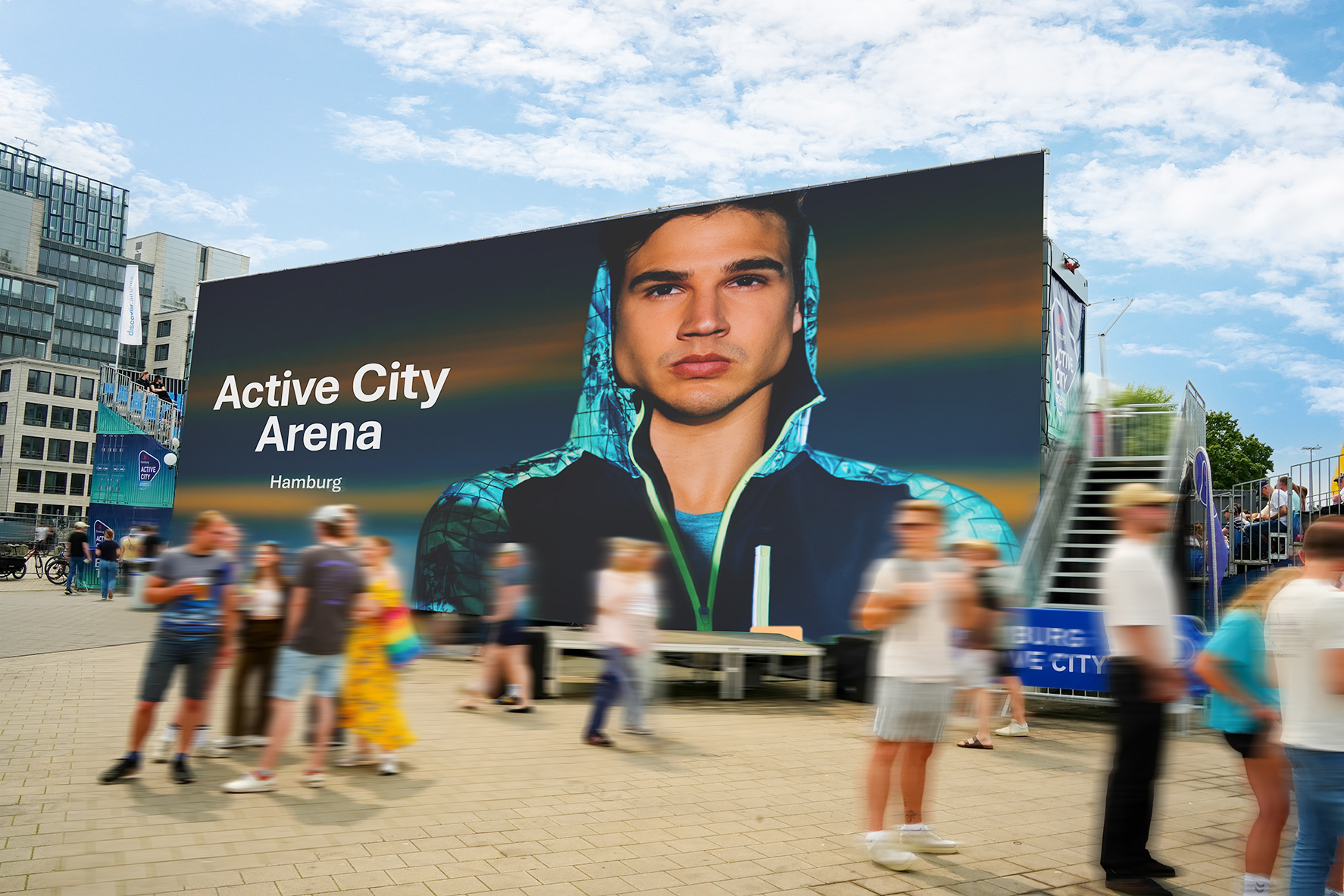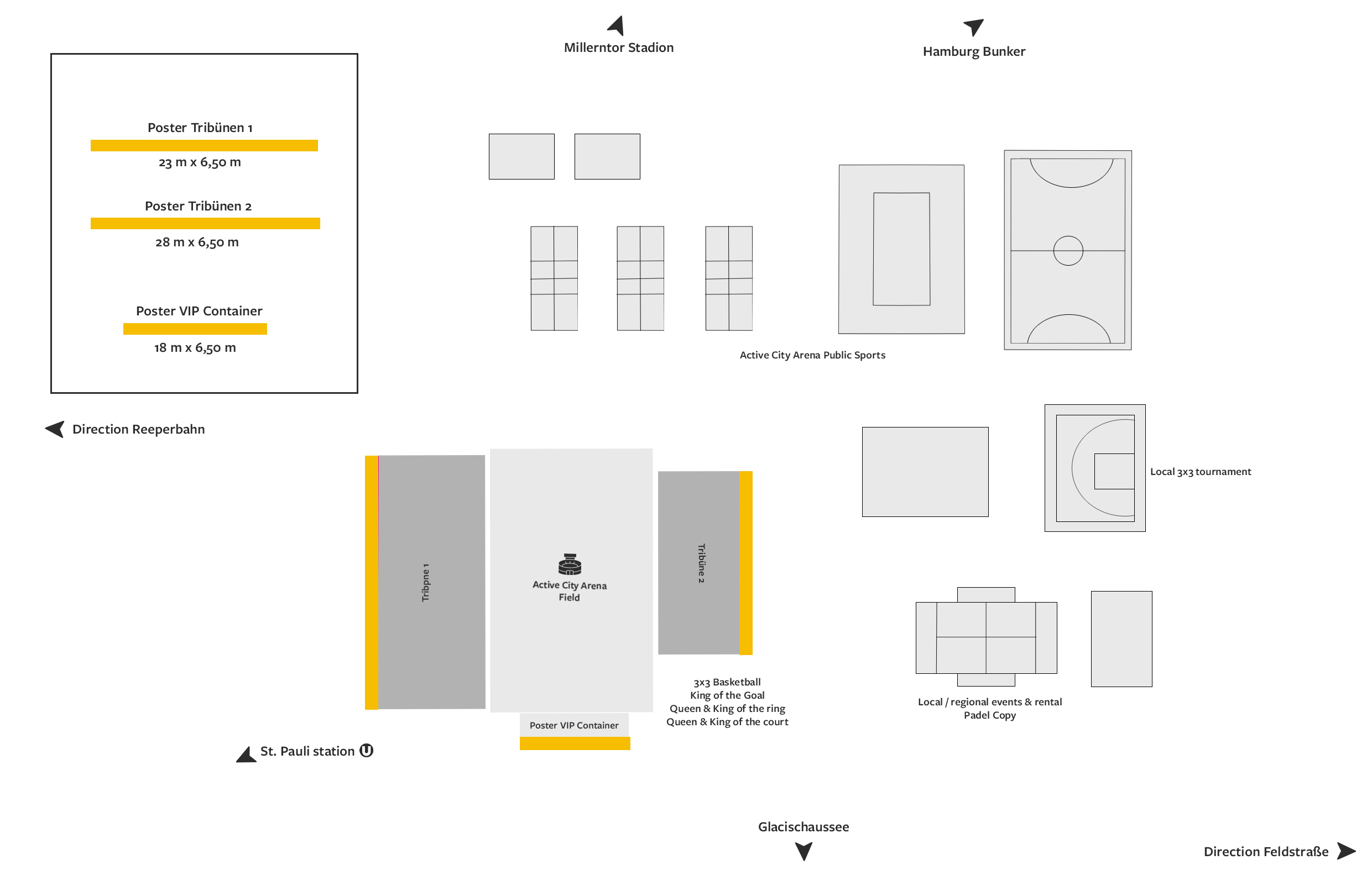 Spanning 443 m² across three highly visible areas, the arena is a true branding highlight. The prestigious "King of the Goal" football tournament and other sporting events will transform the Active City Arena in the heart of Hamburg into the city's hottest spot from mid-May onwards! Located directly between the trendy Schanzenviertel, Karolinenviertel, and Reeperbahn districts, this location guarantees maximum visibility. Thousands of enthusiastic sports fans from Hamburg and across Europe flock here daily for a diverse range of sporting entertainment. In the immediate vicinity: iconic landmarks, including St. Pauli and the Millerntor Stadium.