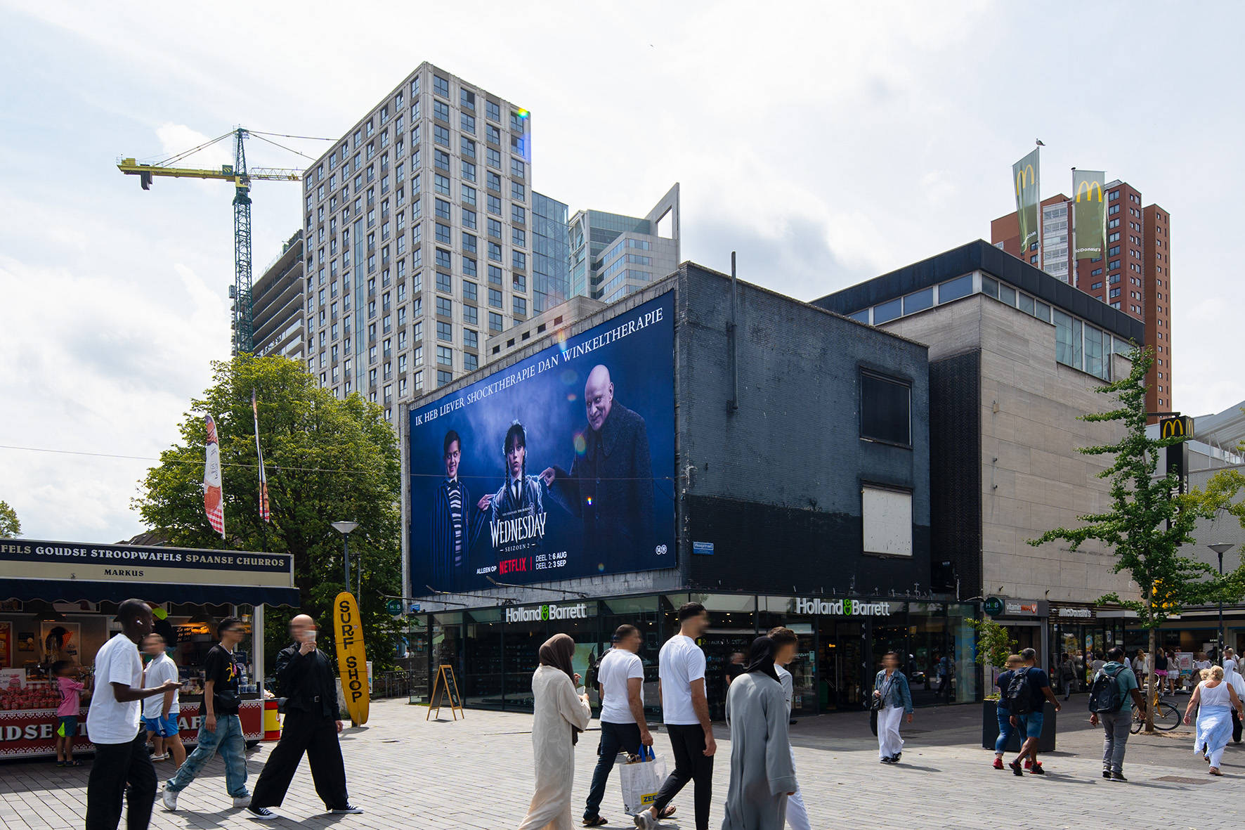 The Giant Poster on Hoogstraat in Rotterdam is located in the shopping district around Hoogstraat and Vlasmarkt. Within walking distance of the Koopgoot, Blaak Station, and a variety of well-known stores, this location attracts tens of thousands of pedestrians, shoppers, and tourists every day. In addition to the many shops, there is a wide range of cafés and restaurants, ensuring a constant flow of visitors throughout the day. The area around this location offers opportunities to reach a diverse audience, from business professionals to students, and from local residents to tourists. Its striking size of 108 m² provides brands with the opportunity to showcase their message on a large and highly visible scale.