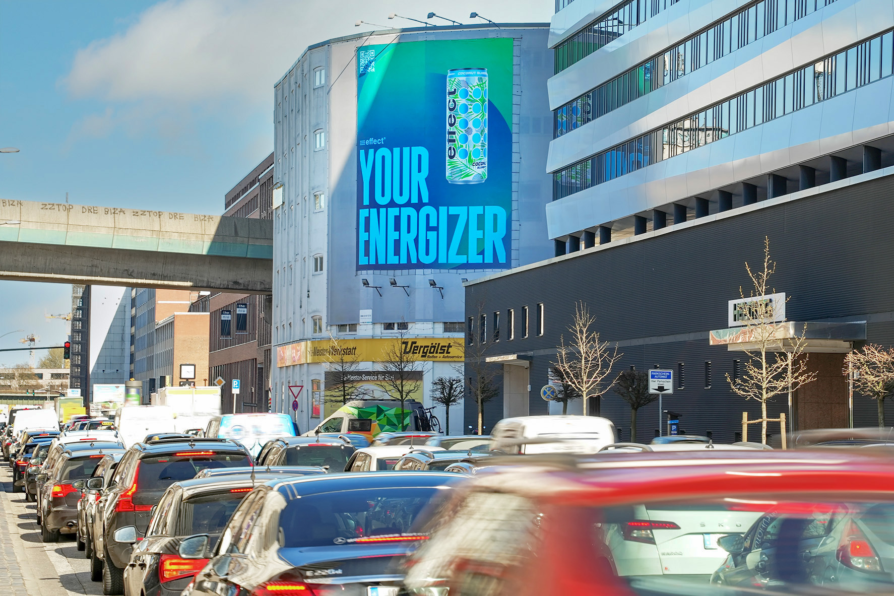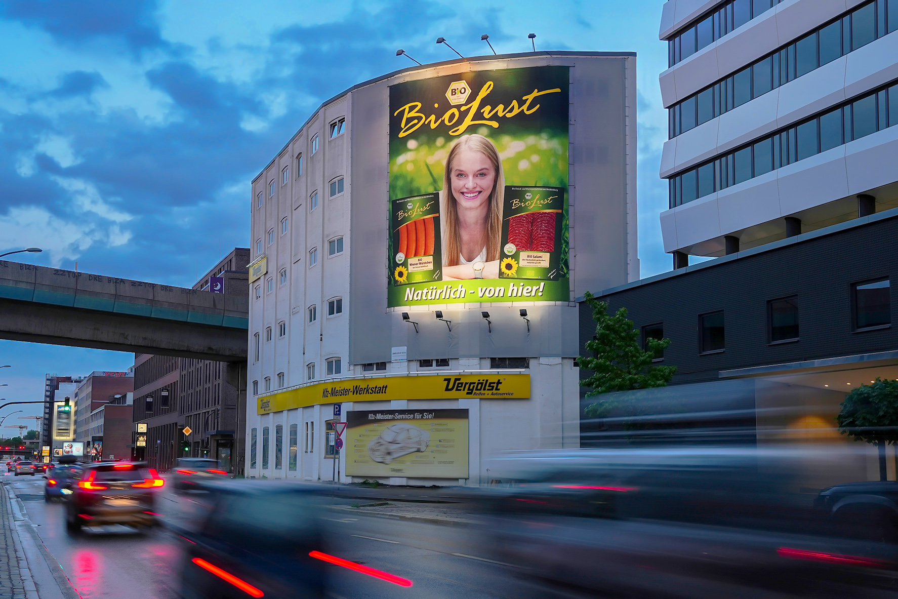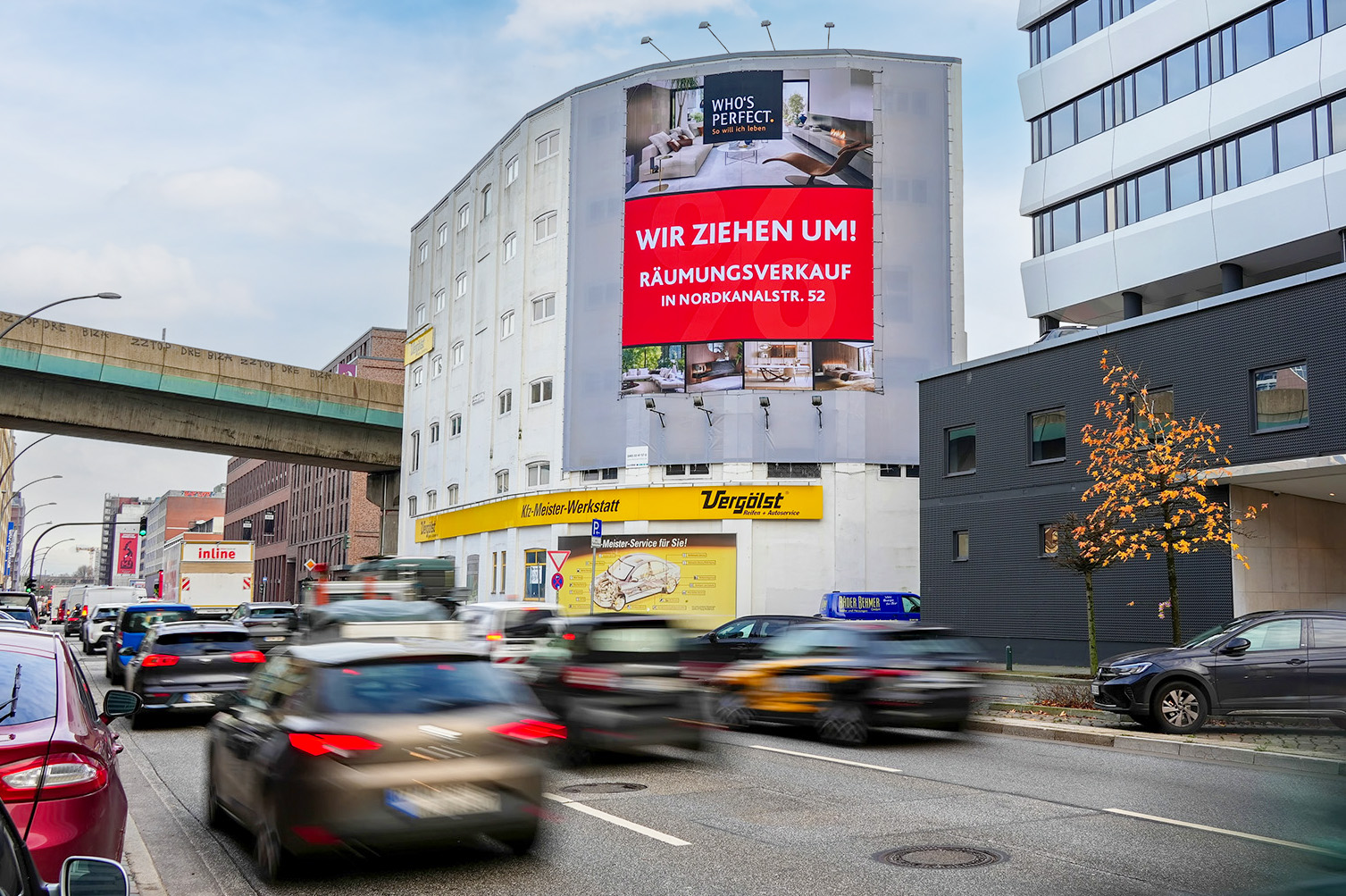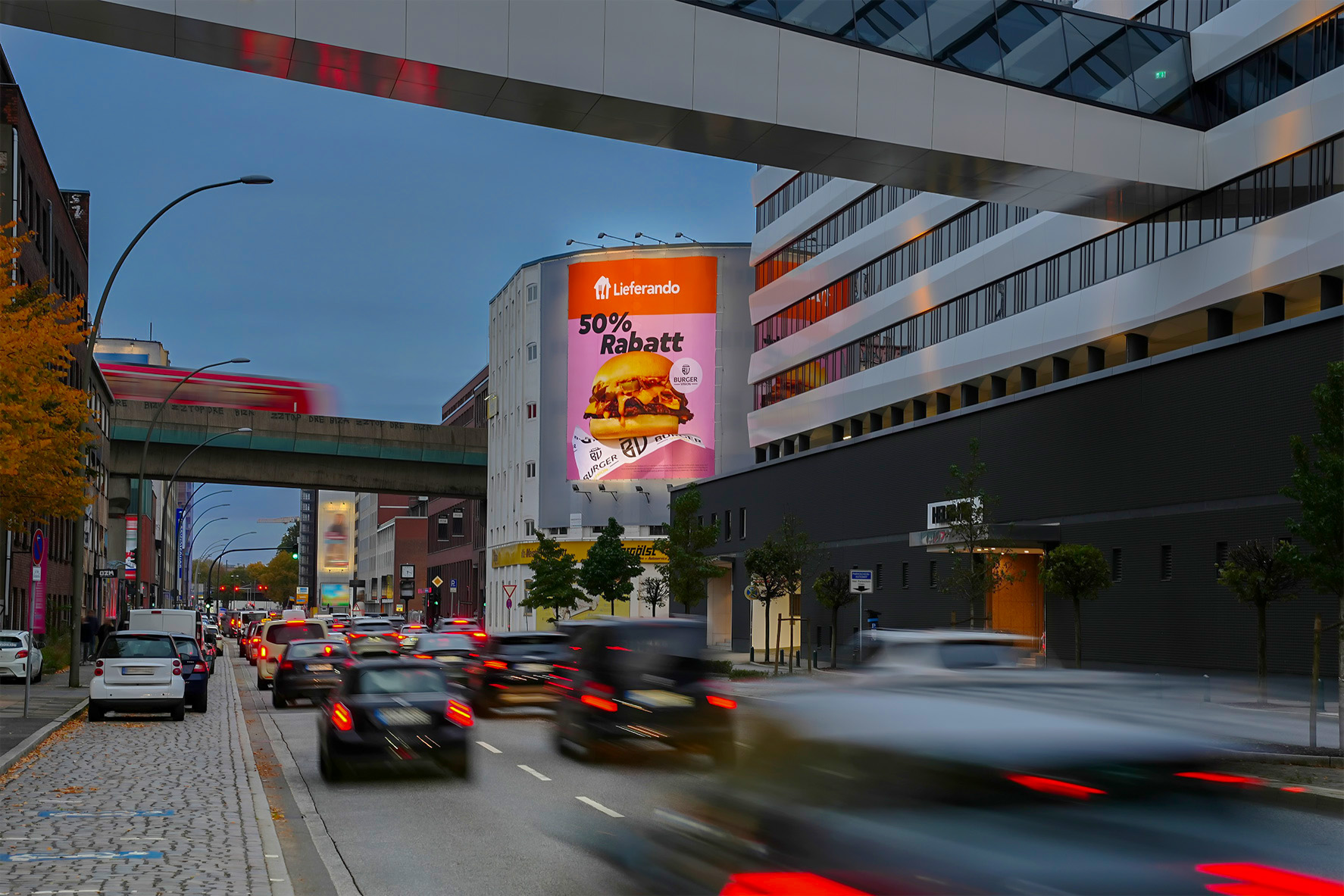 Head-on location on one of Hamburg's major exit roads, the Nordkanalstrasse. Visible 300 metres away. Very high traffic numbers (2,084,130 possible monthly contacts). The site is in a mixed business district where companies such as E-Plus, DAK and Aachen Münchener have their head offices.