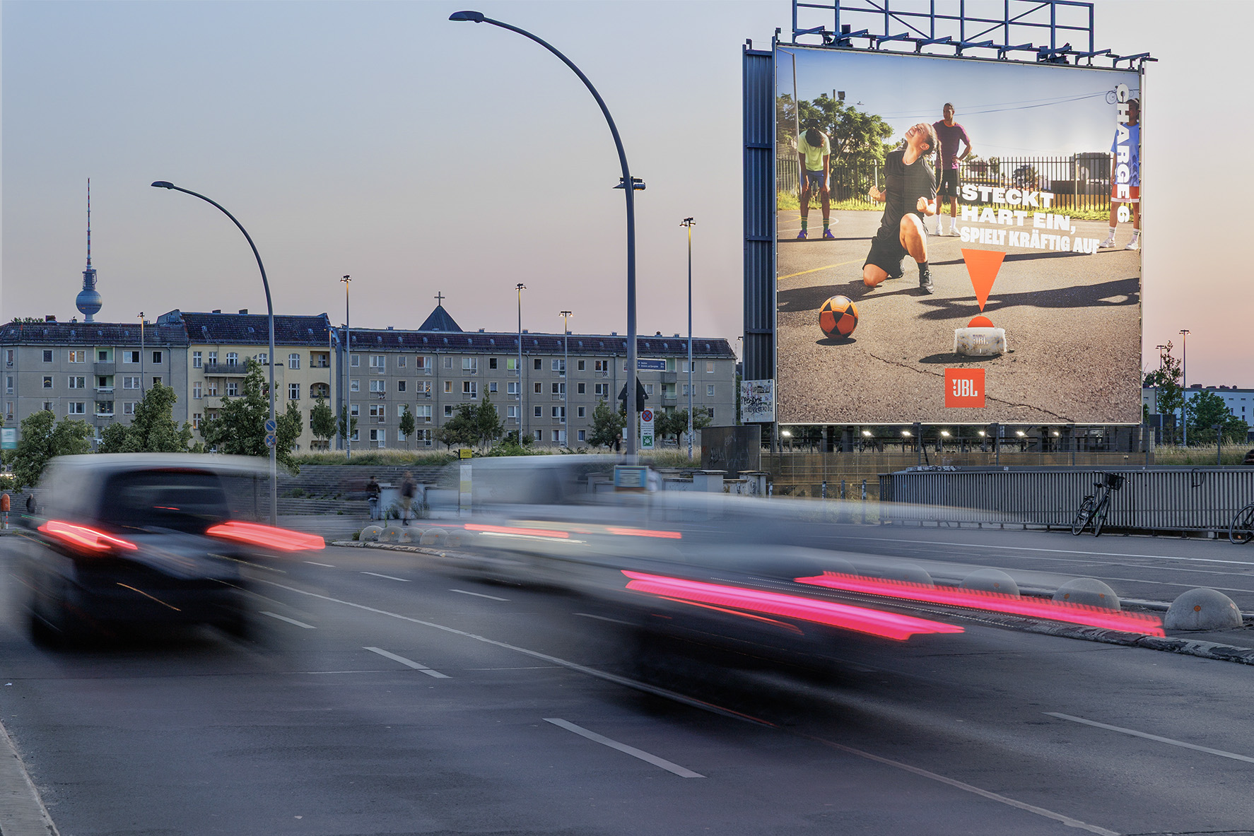 Colourful, lively and diverse - that's Prenzlauer Berg right by the famous Berlin event location Velodrom. Young, outgoing people and sports fans make their way past the Giant Poster towards the city centre and the Velodrom, where concerts and major events regularly take place. The freestanding location of the Giant Poster on the highly frequented Landsberger Allee makes it very visible to the numerous motorists and pedestrians from a distance of over 500 metres.