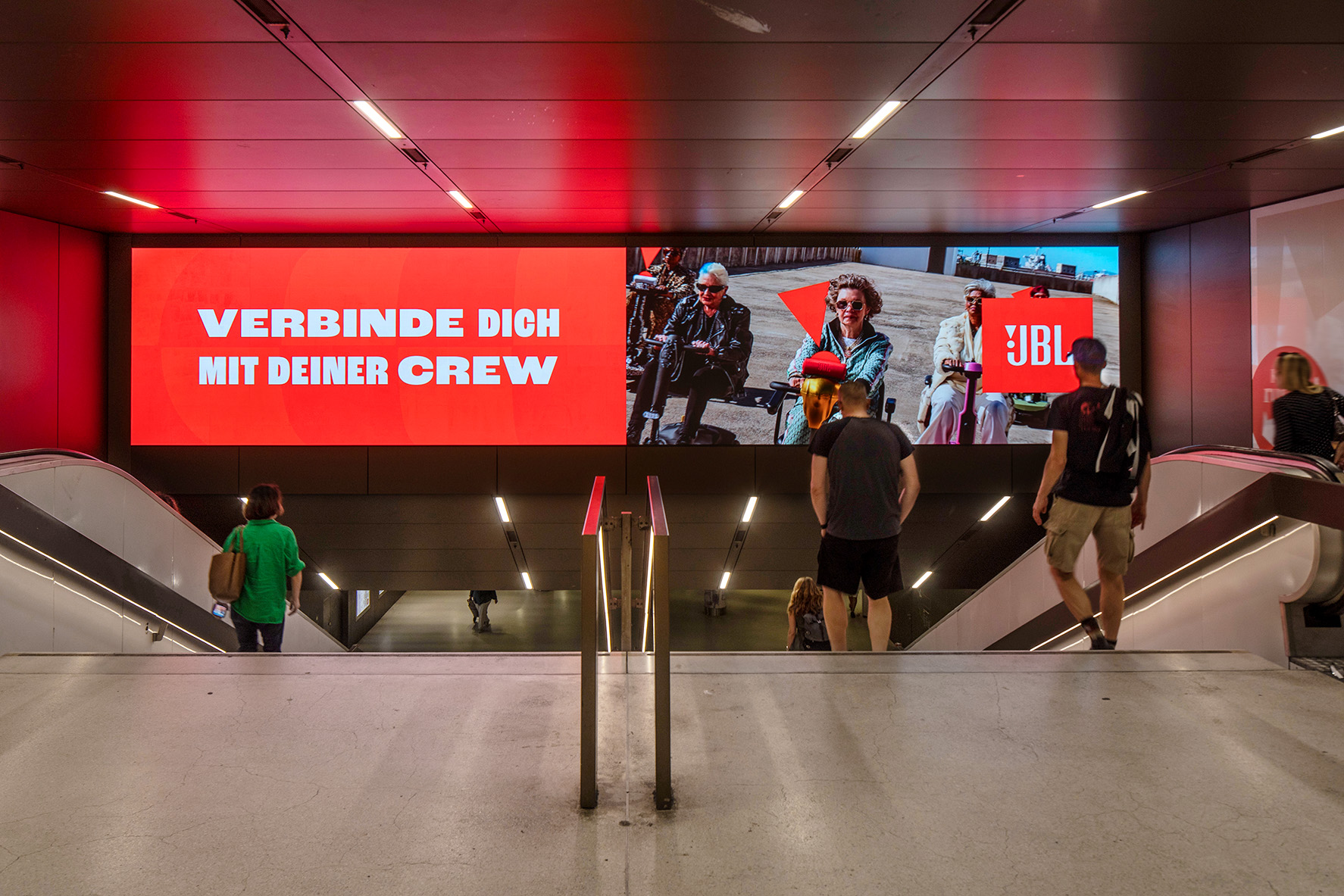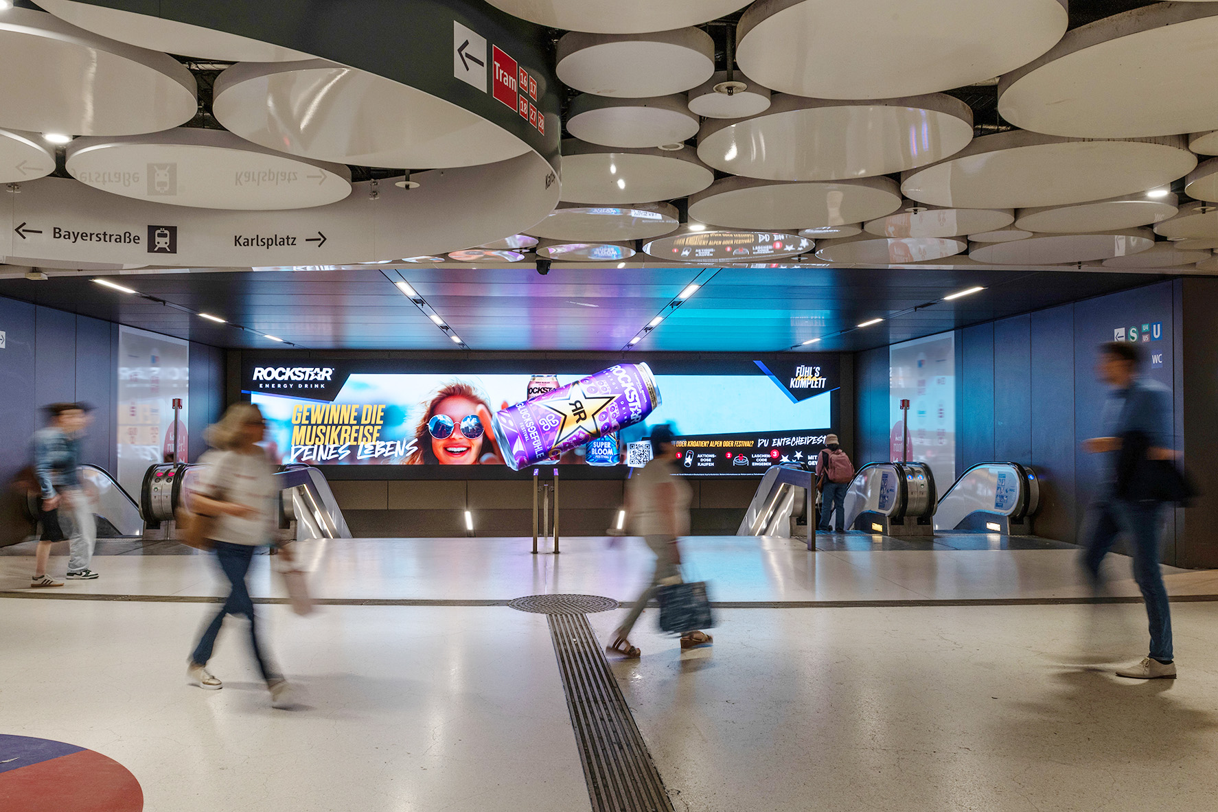 Digital highlight in the middle of Munich city center: directly on Karlsplatz/Stachus are the Stachus Passagen - Europe's largest underground shopping center with around 60 fashion, beauty and lifestyle shops. As an important hub of Munich's traffic, the Stachus Passagen are constantly in motion. Here you will meet ambitious business commuters, trendsetters and students, young Munich residents who love going out and fashion-savvy shopping enthusiasts and tourists looking for new impulses. Our “Stachus Motion” is located in the 1st basement of the Stachus Passagen, prominently placed above the staircase leading to the 2nd basement. With his eyes on the screen, the target group streams past him down to the S-Bahn and subway network. With a size of over 30m², the Stachus Motion offers visibility, premium image quality and flexible switching options - the perfect DOOH branding platform for strong brand messages.