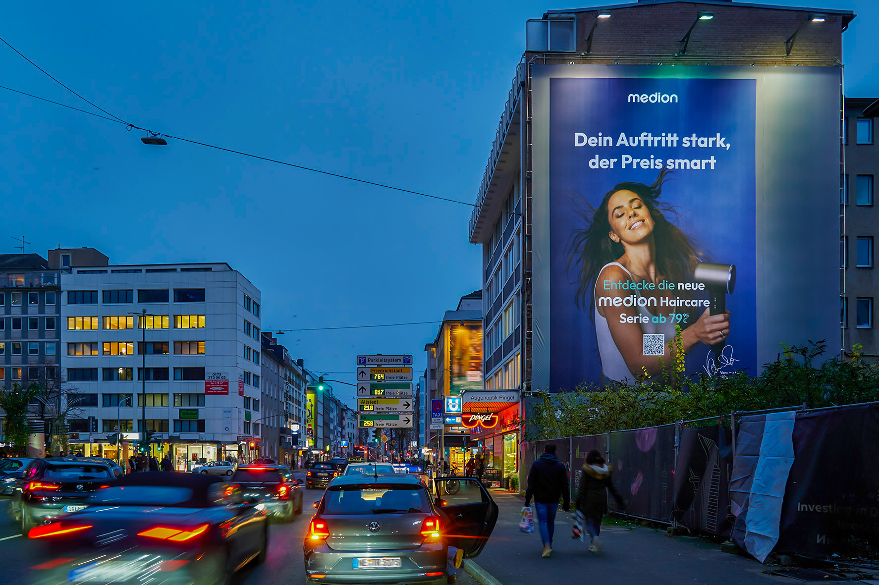 This Giant Poster is situated in an optimum city-centre location, at the junction of the shopping streets Oststraße, Steinstraße and Friedrich-Ebert-Straße. Steinstraße leads directly to the legendary Königsallee, which is packed with well-known luxury brands such as Chanel, Gucci, Cartier, Armani, BOSS, Calvin Klein and Tommy Hilfiger – the premiere meeting place for fashion lovers. The proximity to the city centre and the main station, as well as the numerous hotels nearby, makes the area a popular destination for business professionals and holiday travellers alike. Immermannstraße is also known as Little Tokyo on the Rhine, and is home to numerous Asian restaurants and bars offering Tokyo flair and everything the Japanese heart desires right in the middle of the Rhineland.
