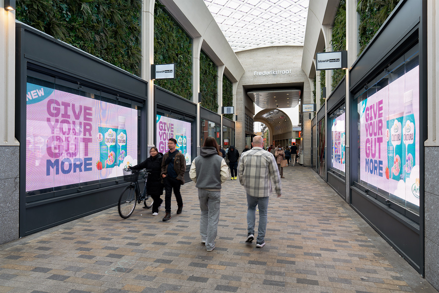 The Arcade is a 32m² digital out-of-home location in the covered Frederikstraat in Tilburg. This modern shopping street connects Pieter Vreedeplein with Heuvelstraat and is home to a variety of fashion and hospitality outlets. The Arcade consists of four high-quality screens, two on each side of the street, allowing visitors to literally walk through the campaign. Brands can use the screens in various ways: they can display the same content across all screens, use each screen individually with its own message, or place content diagonally opposite each other. This flexible setup offers creative opportunities to capture the audience’s attention. Through The Arcade, brands can convey their message in an original and engaging way.