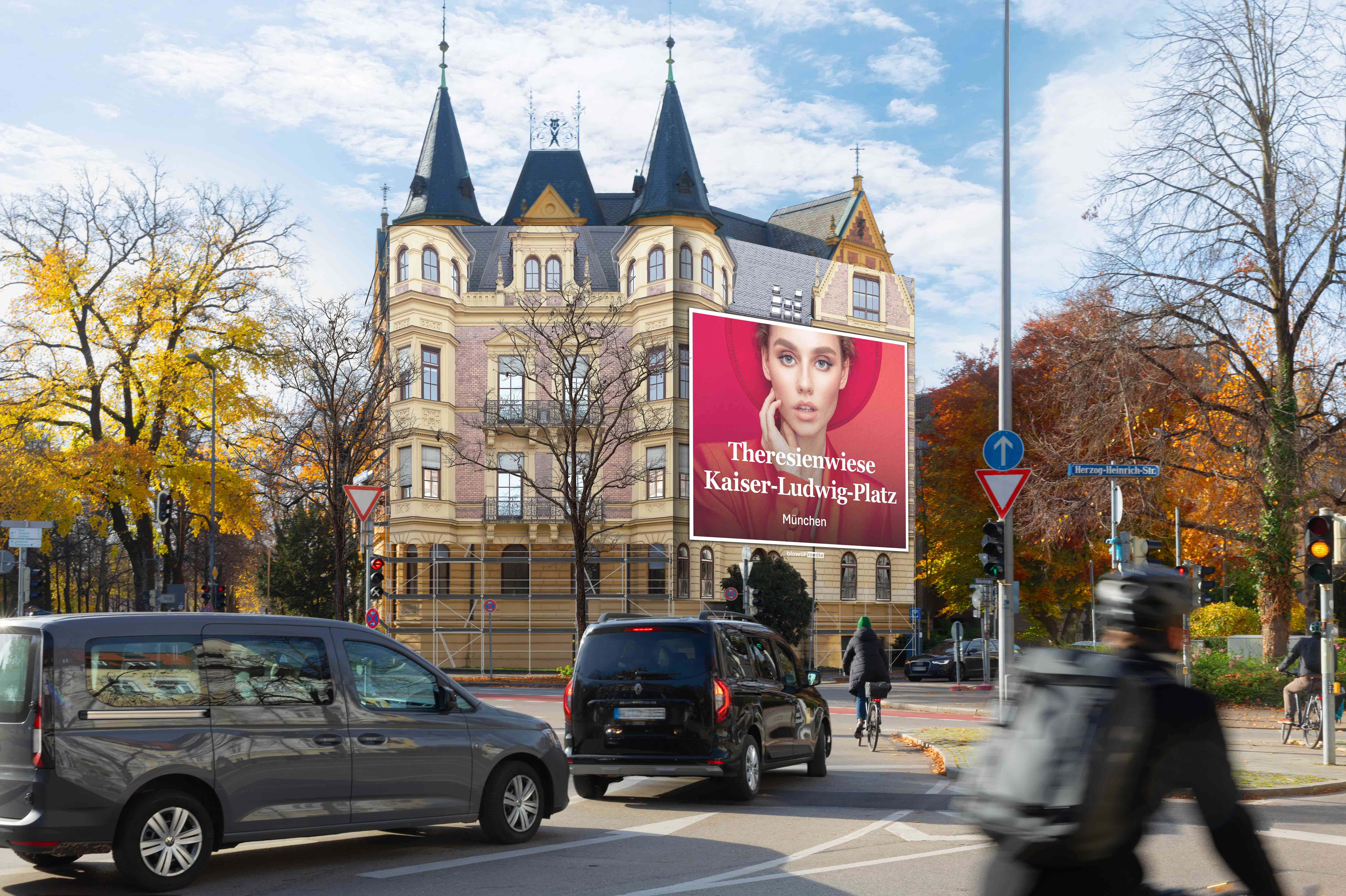 The Giant Poster is located in the heart of Isarvorstadt, one of Munich’s most charming and exclusive residential districts. At Kaiser-Ludwig-Platz, your message reaches thousands of commuters and locals every day as they move through the city. Positioned at the center of the traffic flow between the main train station and Lindwurmstraße, the poster enjoys maximum visibility thanks to the traffic light infront of it. The sophisticated surroundings are home to successful managers, entrepreneurs, and academics with an appreciation for quality and culture, people who value both urban comfort and an attractive environment.